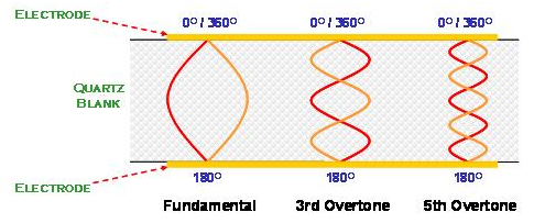 在AT切割角度的石英晶體共振子主要是以厚度剪切振蕩模態(tài)存在. 石英晶體在共振時, 除了基本波振蕩之外,高階的倍頻共振也與基本波振蕩同時存在于石英晶體的電極區(qū)域之間. 但是, 由于壓電材料的電極是電氣相位相反的振動環(huán)境, 所以, 祇有奇數(shù)倍(odd number)的高頻倍頻可以發(fā)生, 偶數(shù)倍(even number)的倍頻共振在石英晶體共振子是不會存在的(圖十).