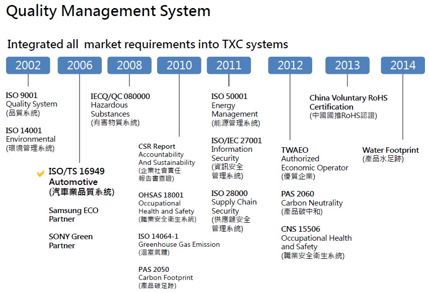 臺灣晶技晶體科技本于‘善盡企業責任、降低環境沖擊、提升員工健康’的理念,執行各項環境及職業安全衛生管理工作;落實公司環安衛政策要求使環境暨安全衛生管理成效日益顯著,不僅符合國內環保、勞安法令要求,同時也能達到國際環保、安全衛生標準. 公司于2008年12月通過OHSAS18001職業安全衛生管理系統驗證,提供勞工符合系統要求的安全衛生工作環境.