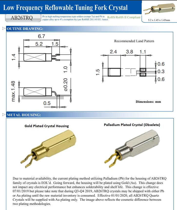| AB26TRQ-32.768KHZ-T | Abracon LLC | AB26TRQ | kHz Crystal (Tuning Fork) | 32.768kHz | Cylindrical Can, Radial | 0.264" L x 0.059" W (6.70mm x 1.50mm) |