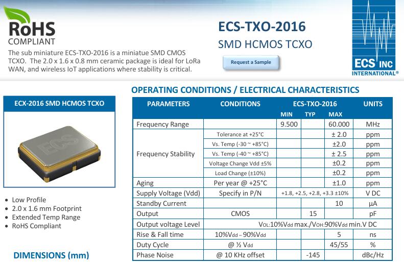 晶振之重,在于其為物聯網設備提供“心跳”般的精準時鐘信號.作為一款溫補晶振(TCXO),ECS-TXO-2016最亮眼的特質便是-40~+85℃寬溫范圍內2.5ppm的頻率穩定度.這一精度意味著在極寒的極地探測或高溫的工業車間,設備時鐘誤差仍能控制在極低范圍.LoRaWAN等無線通信技術對時序同步要求嚴苛,正是這種穩定性讓遠程數據傳輸精準無誤,避免了因時鐘偏差導致的信號失真或數據丟失,成為物聯網可靠運行的“定盤星”.