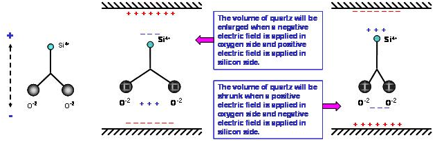 氧原子的水平位置變化時(shí), 鄰近的另一個(gè)氧原子會(huì)相對的產(chǎn)生排斥或吸引的力量, 迫使氧原子回到原來的空間位置. 因此, 電場的力量與原子之間的力量會(huì)相互牽動(dòng), 電場的改變與水平方向的形變是形成交互作用狀態(tài). 這個(gè)交互作用會(huì)形成一個(gè)在石英材料耗能最小的振動(dòng)狀態(tài), 祇要由電場持續(xù)給與能量, 石英材料"9HT11-32.768KAZF-T"就會(huì)與電場之間維持一個(gè)共振的頻率. 這個(gè)壓電效應(yīng)下氧原子的振幅與電場強(qiáng)度及電場對二氧化硅的向量角度有相對應(yīng)的關(guān)系.在實(shí)際的應(yīng)用上, 電場是由鍍在石英芯片上的金屬電極產(chǎn)生, 電場與二氧化硅的向量角度則是由石英晶棒的切割角度來決定.
