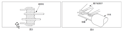 插件型晶振安裝注意事項:安裝時的注意事項導腳型晶振• 構造圓柱型晶振 (VT, VTC) 用玻璃密封 (參閱圖 1 和圖 2)。修改插件晶振彎曲導腳的方法(1) 要修改彎曲的導腳時,以及要取出晶振等情況下不能強制拔出導腳,如果強制地拔出導腳,會引起玻璃的破裂,而導致殼內真空濃度的下降,有可能促使晶振特性的惡化以及晶振芯片的破損(參閱圖 3)。(2) 要修改彎曲的導腳時,要壓住外殼基側的導腳,且從上下方壓住彎曲的部位,再進行修改(參閱圖 4)。
