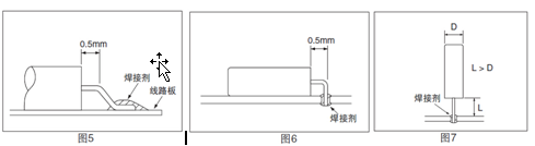彎曲導腳的方法(1) 將導腳彎曲之后并進行焊接時,導腳上要留下離外殼0.5mm的直線部位。如果不留出導腳的直線部位而將導腳彎曲,有可能導致玻璃的破碎 (參閱圖5 和圖6)。(2) 在導腳焊接完畢之后再將導腳彎曲時,務必請留出大于外殼直徑長度的空閑部分 (參閱圖7)。如果直接在外殼部位焊接,會導致殼內真空濃度的下降,使晶振特性惡化以及晶振芯片的破損。應注意將晶振平放時,不要使之與導腳相碰撞,請放長從外殼部位到線路板為止的導腳長度 (L) ,并使之大于外殼的直徑長度(D)。