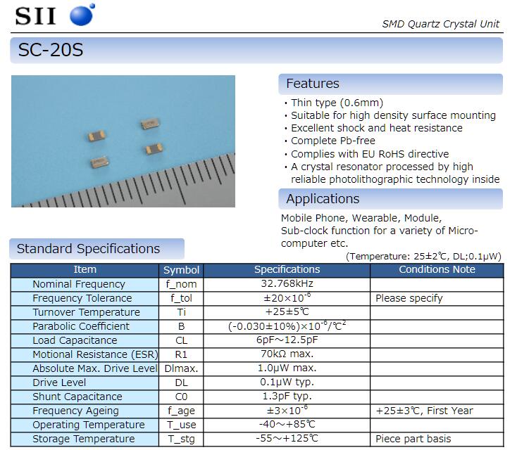| Q-SC32S0322070AAAF | Seiko Instruments | SC-32S | 32.768kHz | ±20ppm | 7pF | -40°C ~ 85°C | 0.126" L x 0.059" W (3.20mm x 1.50mm) |