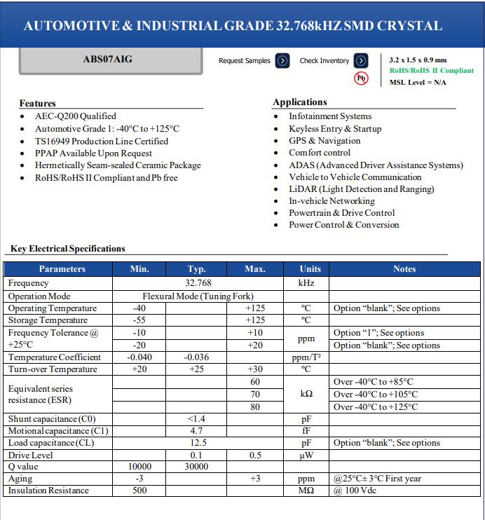 隨著行業(yè)的需求增長,艾博康公司推出編碼ABS07AIG-32.768KHZ-9-1-T無源晶振,符合AEC-Q200標準 汽車1級:-40°C至+125°C TS16949生產(chǎn)線認證 PPAP可應要求提供 氣密接縫密封陶瓷封裝 符合RoHS/RoHS II標準,無鉛.應用程序 信息娛樂系統(tǒng) 無鑰匙進入和啟動GPS和導航,舒適控制 ADAS(高級駕駛輔助系統(tǒng)),車輛對車輛通信,激光雷達(光探測和測距) 車載網(wǎng)絡,動力系統(tǒng)和驅(qū)動控制,電源控制和轉換.