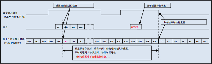 執行重置時不清除進位信息,為此請在設定秒寄存器后不到1秒的時間內重置低于1秒的計時器;