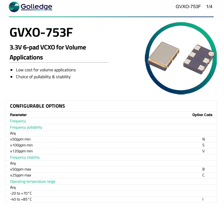 更多>>GVXO-753F/VC 27.0MHZ 7050 6P VCXO壓控晶振Golledge