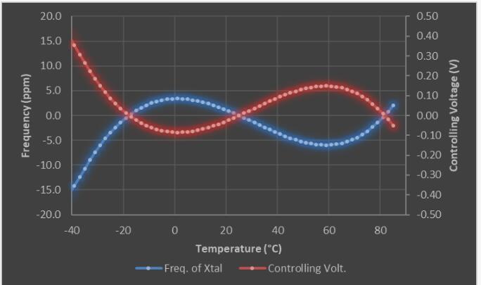 控制信號(hào)發(fā)生器是TCXO的心臟.第一步,它借助內(nèi)置溫度傳感器觀察環(huán)境溫度(ΔT)的變化.使用具有預(yù)定義參考電壓的比較器,感應(yīng)到的溫補(bǔ)晶振溫度(ΔT)將轉(zhuǎn)換為成比例的溫度電壓(V_T).下一步,使用多項(xiàng)式函數(shù)發(fā)生器將溫度電壓(V_T)轉(zhuǎn)換為特定的控制電壓(V_C.