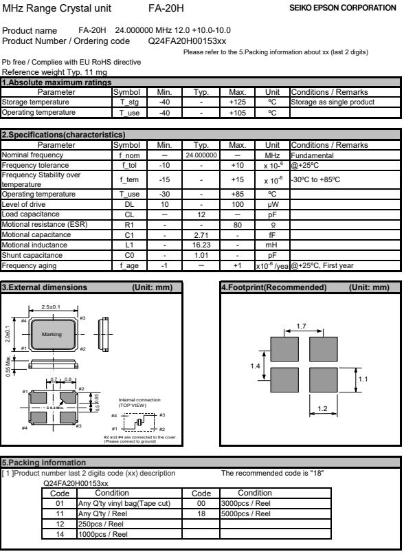 | Q24FA20H0015600 | 2.5 x 2 x 0.55mm | FA-20H | 24.000000 MHz | 7 pF | +/-10 ppm | -20 to +75 °C |