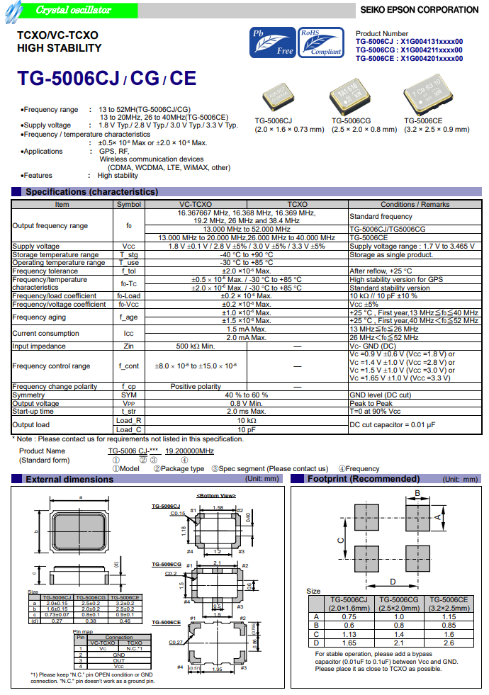 | X1G0041310016 | TG-5006CJ | 19.200000 MHz | 2.00 x 1.60 x 0.73 mm | Clipped sine wave | -30 to +85 °C | +/-1ppm | +/-2.0 ppm |