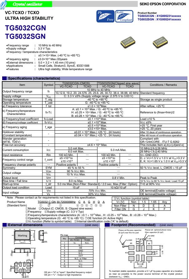 | X1G005231000900 | TG5032CGN | 25.000000 MHz | 5.00 x 3.20 x 1.45 mm | 3.135 to 3.465 V | +/-1.0 ppm | -40 to ++85 °C | +/-0.14 ppm |