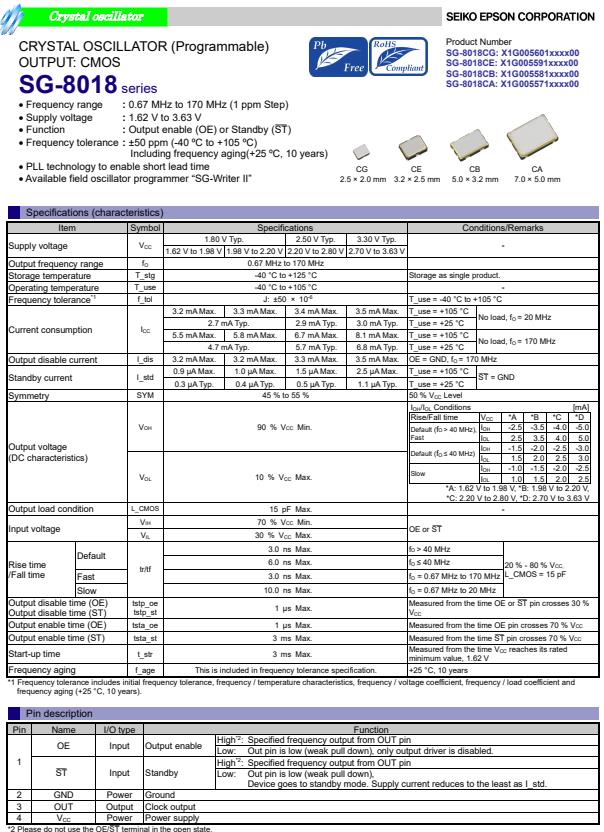 | X1G005581004100 | SG-8018CB | 30.000000 MHz | 5.00 x 3.20 x 1.30 mm | CMOS | 1.620 to 3.630 V | -40 to 105 °C | +/-50 ppm |