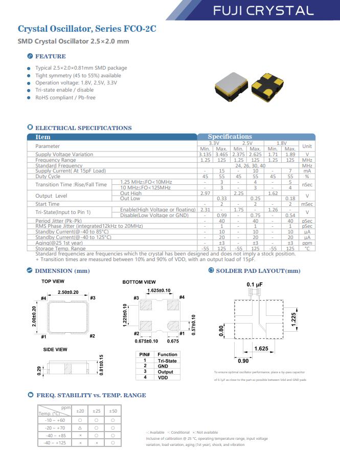 | FCO2C02457618CFE00 | Fuji 有源晶振 | XTAL OSC XO 24.576MHZ CMOS SMD | FCO-2C | 1.8V | ±50ppm | -20°C ~ 70°C | 4腳 | 2520 |